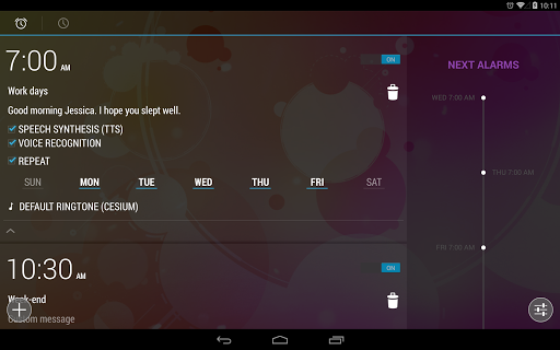 Add to that all the settings imaginable on a clock (programming various alarms over several days, setting names, volume, times...) and you get WakeVoice, the most innovative alarm clock that you can find on the Android market.