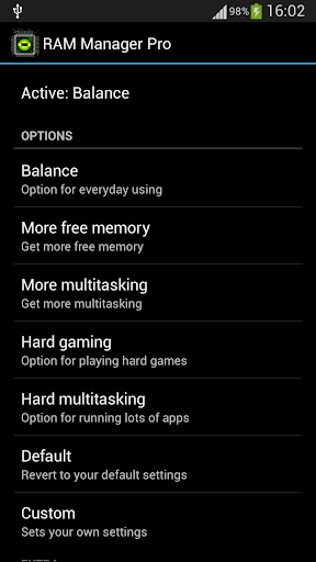 ??Balance - Option which makes your RAM to the best optimization, this option is for everyday using. Use this option when you want to have fast phone without lags.